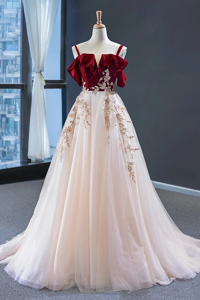 Decent A Line Spaghetti Strap Wedding Dress Chic Ruffle Satin Red Wedding Dresses Lace Appliques Boho Wedding Dress with Lace Up Back