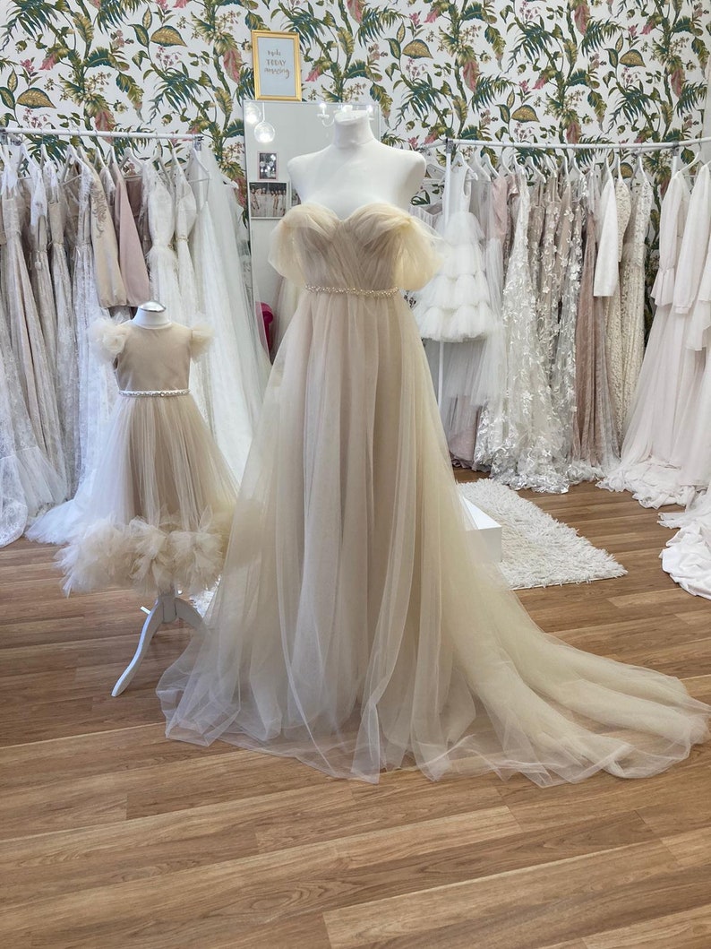 Elegant Light Champagne Tulle Off-the-shoulder Wedding Dresses with Crystals Beading