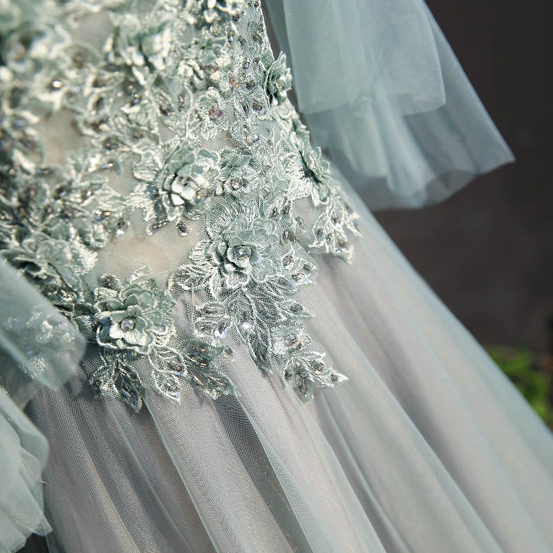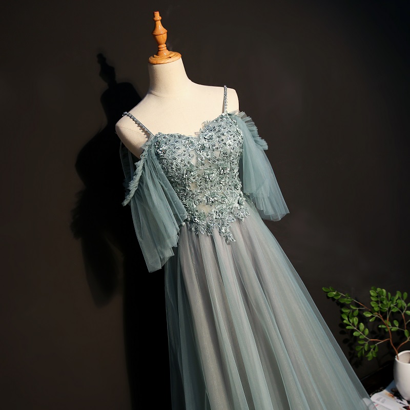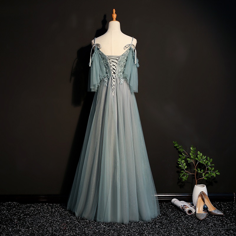 Beautiful Spaghetti Gray Evening Dresses Beaded Boho Evening Dresses with 3D Flowers Floor Length A Line Prom Dresses with Lace Up Back