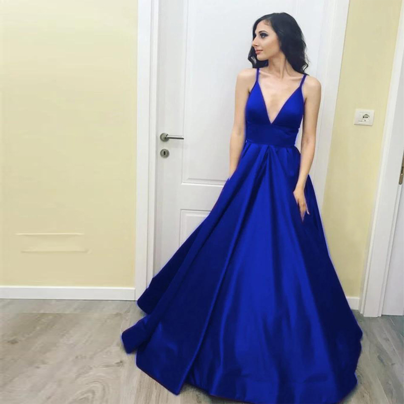 Sexy Spaghetti A-Line Satin Royal Blue Prom Dresses Pleated Skirt Cheap Prom Dresses under 100 Bodice Simple Black Formal Dresses