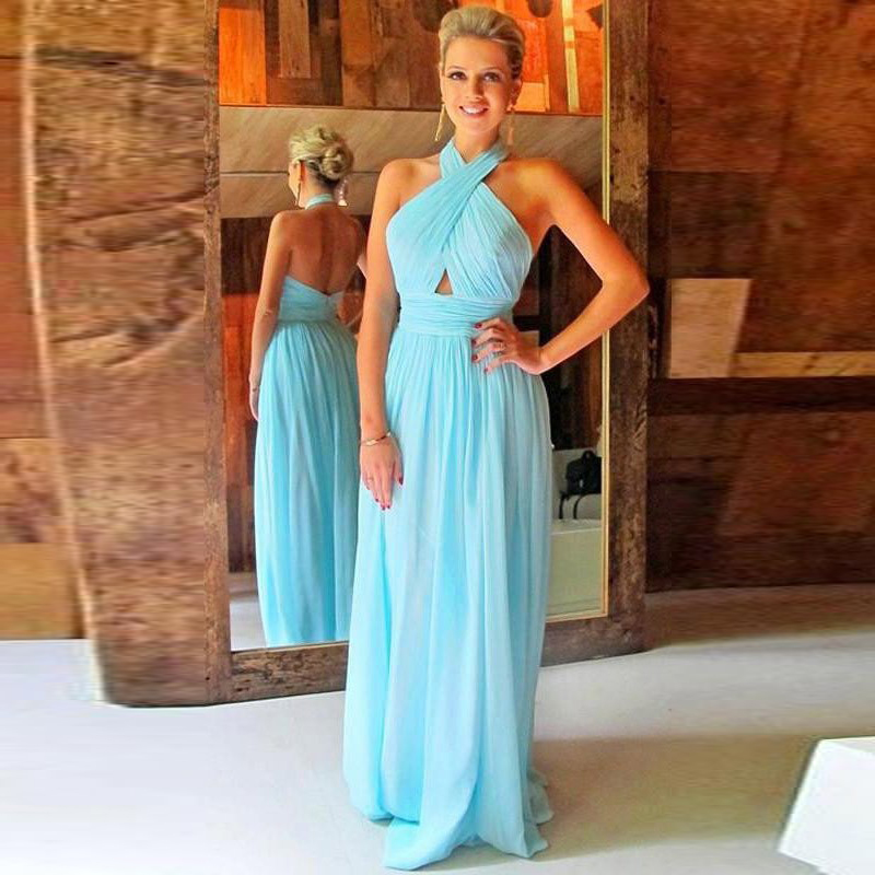 Chiffon Halter Blue Bridesmaid Dresses A-Line Backless Rehearsal Dinner Dress