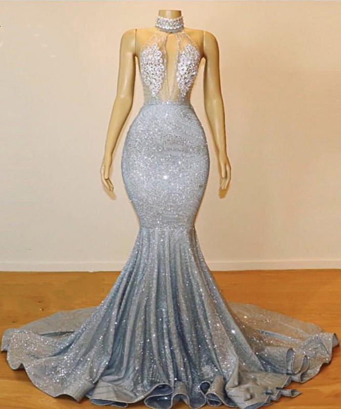 Shimmering Fabric Halter Silver Prom Dresses Mermaid Lace Appliques Sweep Train Sexy Party Dresses Backless Evening Dress Abendkleider