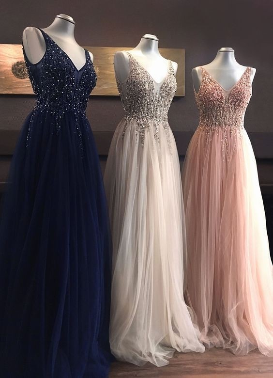 Deep V-Neck Long Prom Dresses,beaded prom dresses,pink prom dress,elegant evening dresses