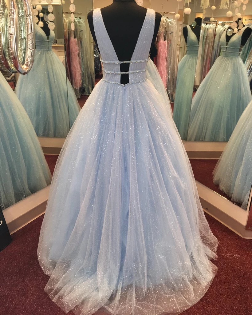 Sparkly Tulle Pink Prom Dresses V-Neck Crystal Beading A-Line Plus Size Evening Dresses Open V Back Pink Party Dress