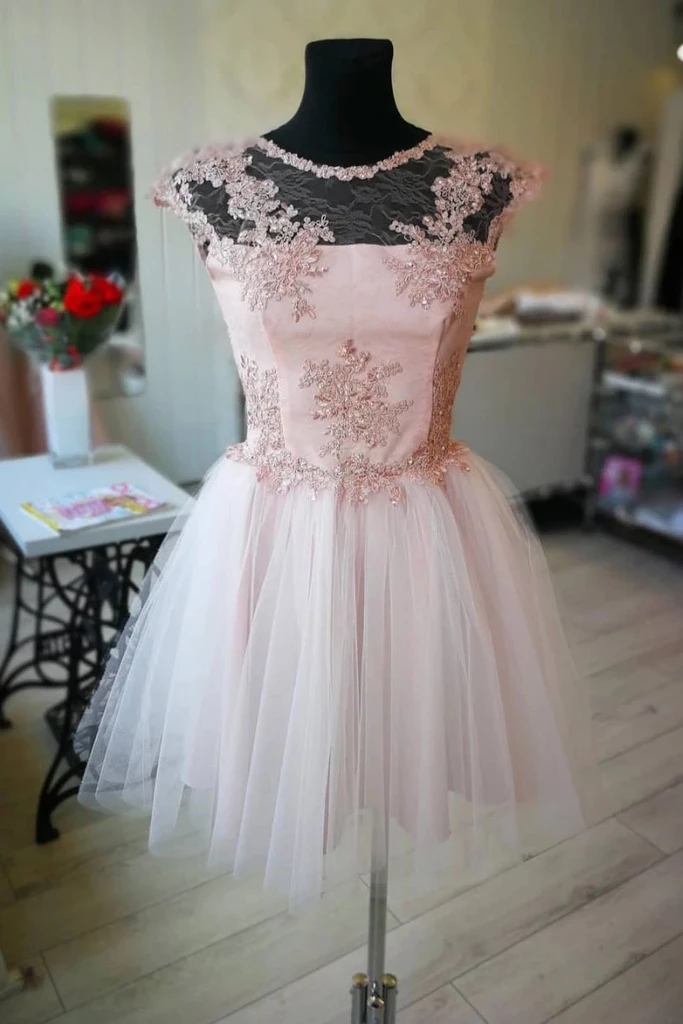 Sweet Jewel Neck Illusion Sleeve Pink Prom Dresses Tulle A-Line Short Party Dresses Lace Appliques Sequin Cute Homecoming Dresses