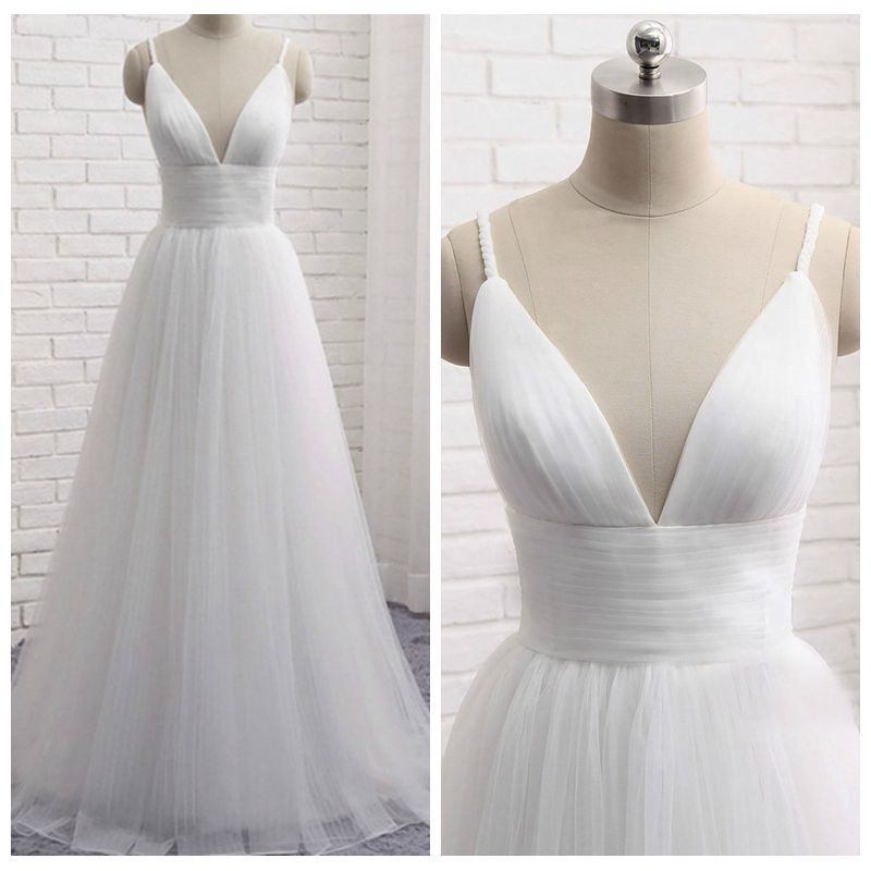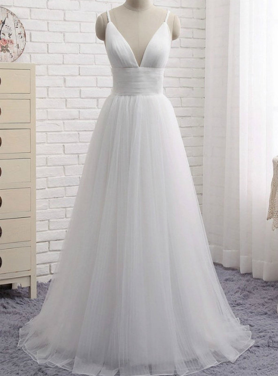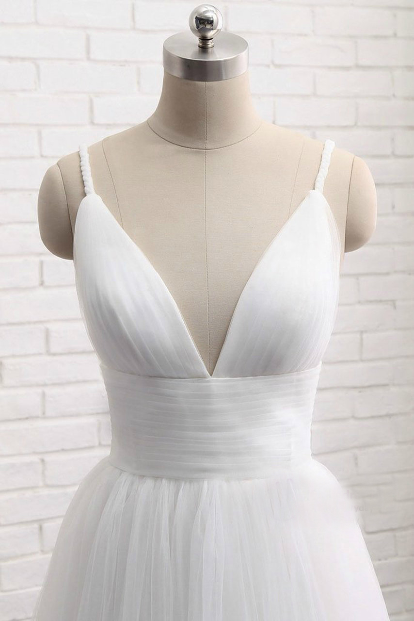 Romantic Spaghetti Straps A-Line Tulle Wedding Dresses for The Beach with Sweep Train Casual Wedding Dress Low Back Cheap Wedding Gowns