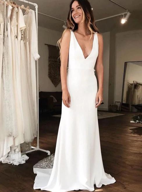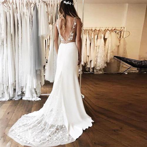 Sexy Deep V-Neck Sleeveless Satin Sheath Wedding Dresses Low Cut Back Appliques Sexy Wedding Dresses Court Train Unique Wedding Gowns