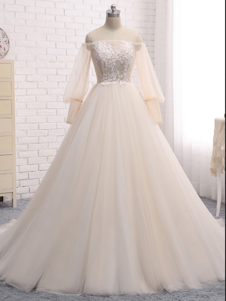 Strapless A Line Wedding Dress with Sweep Train Tulle Champagne Wedding Dresses with Lace Up Back Lace Applique Long Sleeve Wedding Dress