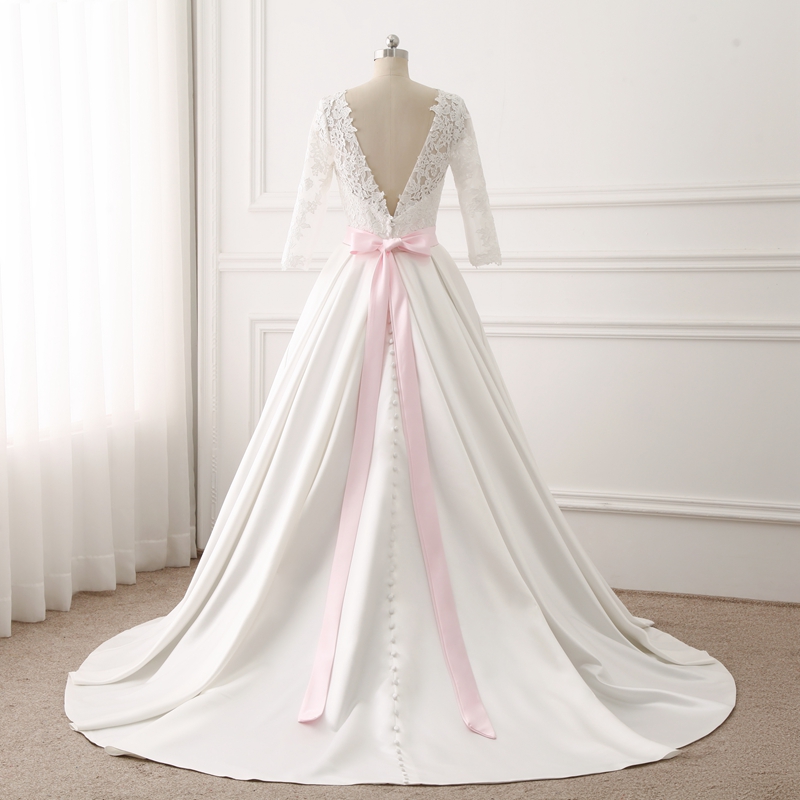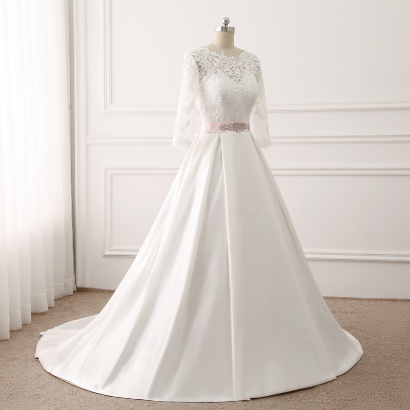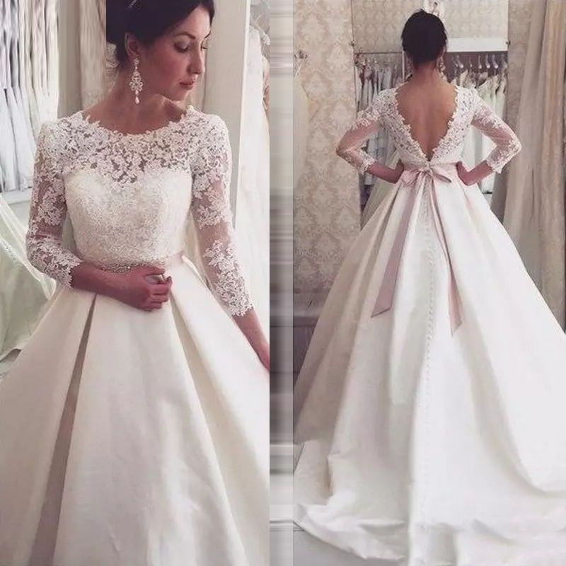 Vintage Scoop 3/4 Long Sleeve Lace Ball Gown Wedding Dresses with Court Train Lace Wedding Dress with Beaded Sash vestidos de novia