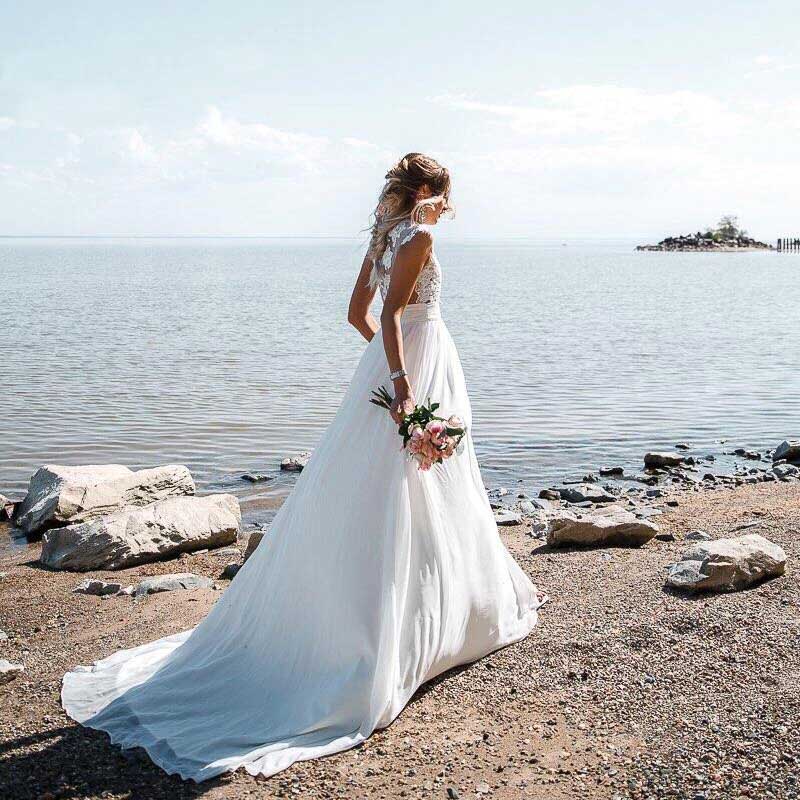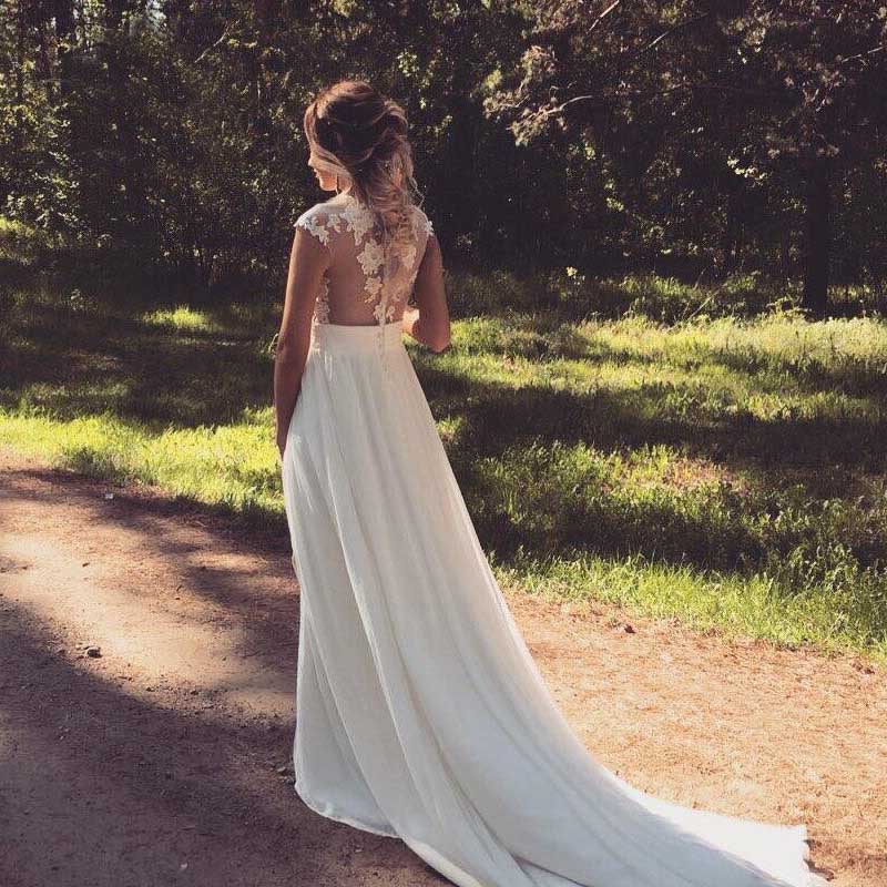 Jewel Neck Illusion Sleeve Beach Wedding Dresses Lace Appliques Sweep Train Casual Wedding Dresses See Through Back Cheap Wedding Gowns