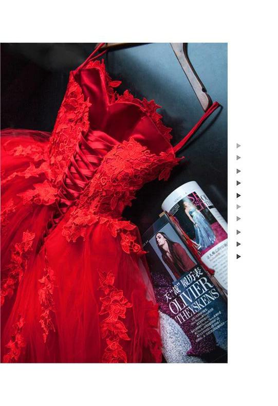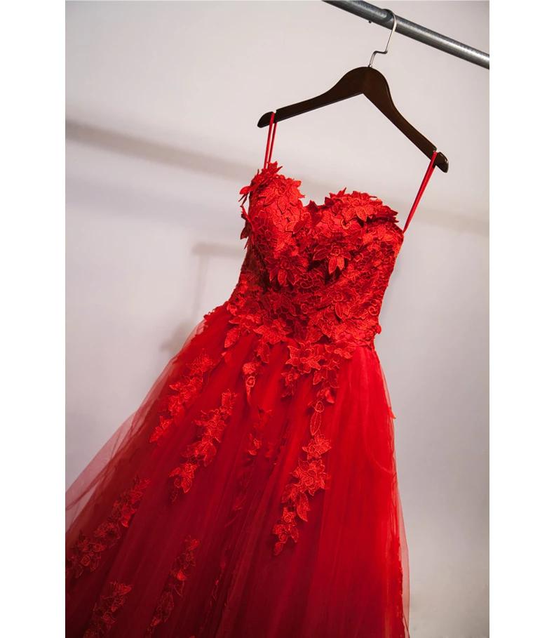 Elegant Evening Gowns Sweetheart Tulle Red Evening Dresses Lace Appliques Sweep Train Maternity Evening Dresses Cheap Lace Up Back