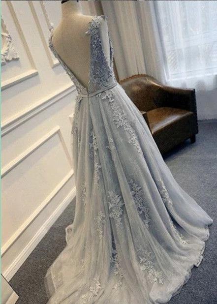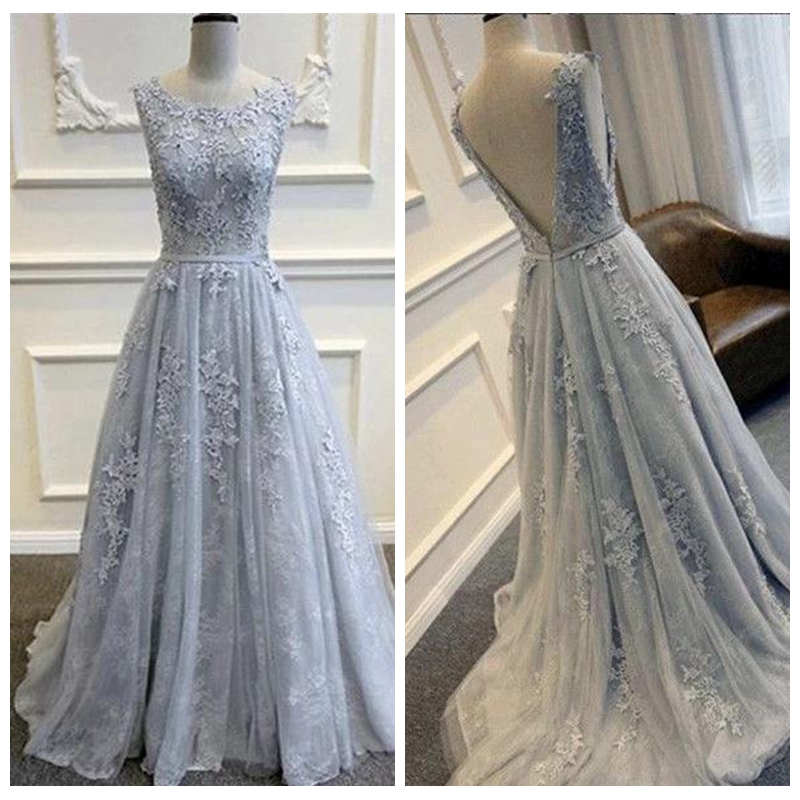 Charming Scoop A-Line Silver Prom Dresses Lace Appliques Sweep Train Elegant Evening Dresses Low V Back Long Evening Gowns