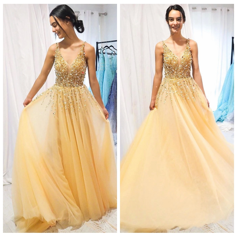 Charming Spaghetti Straps A-Line Tulle Yellow Prom Dresses Sweep Train Major Beaded Prom Dresses Low V Back Formal Evening Gowns
