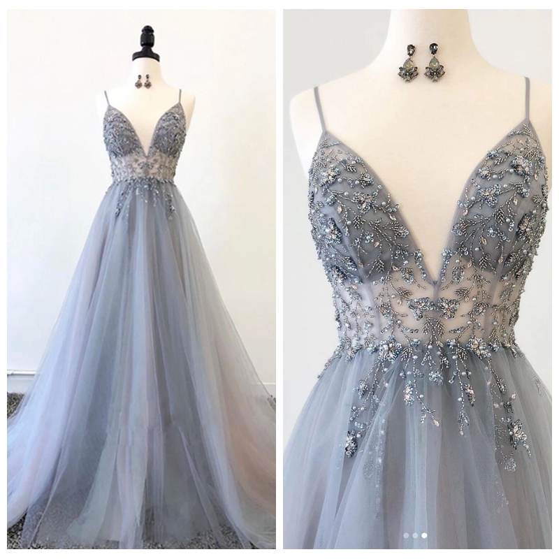 Spaghetti Straps A-Line Tulle Sexy Prom Dresses Sweep Train Major Beaded Prom Dresses Low V Back Affordable Evening Dresses