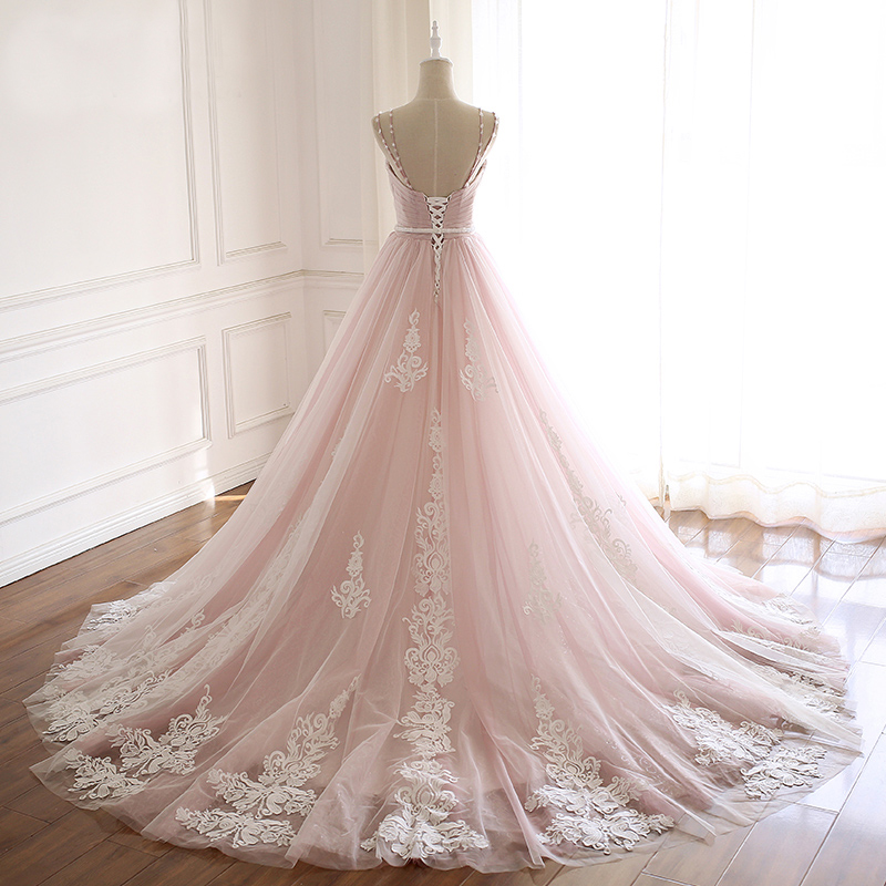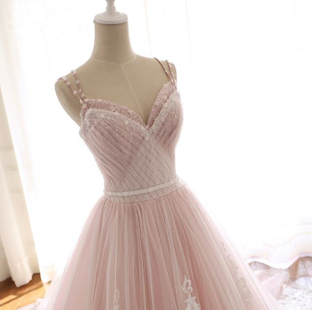 Fairy Spaghetti Straps Light Pink Prom Dresses Ball Gown Beading Tulle Prom Dresses White Lace Appliques Lace Up Back Elegant Evening Gowns