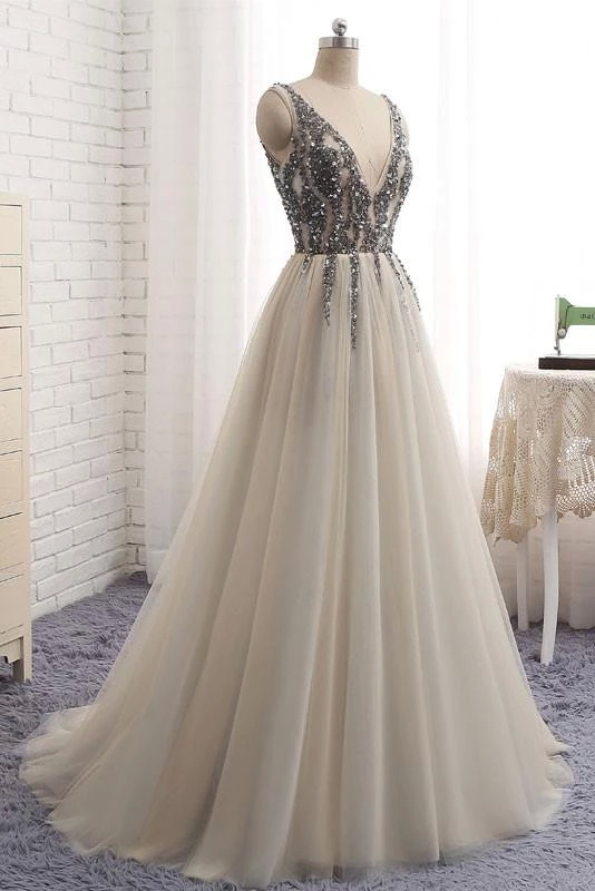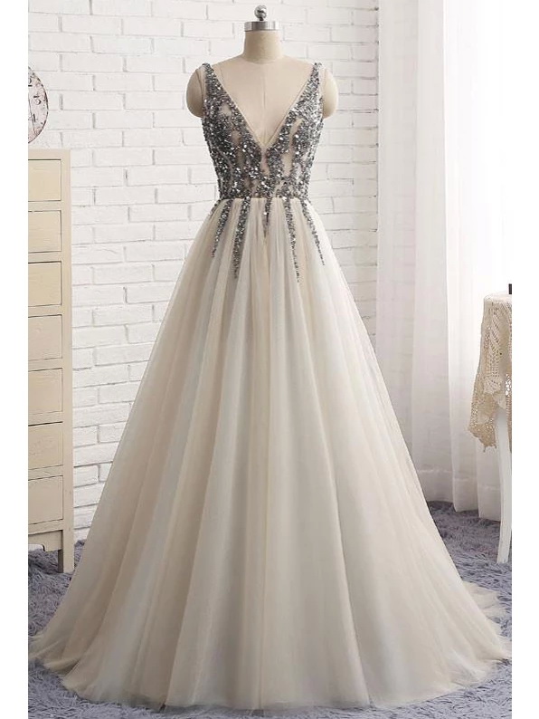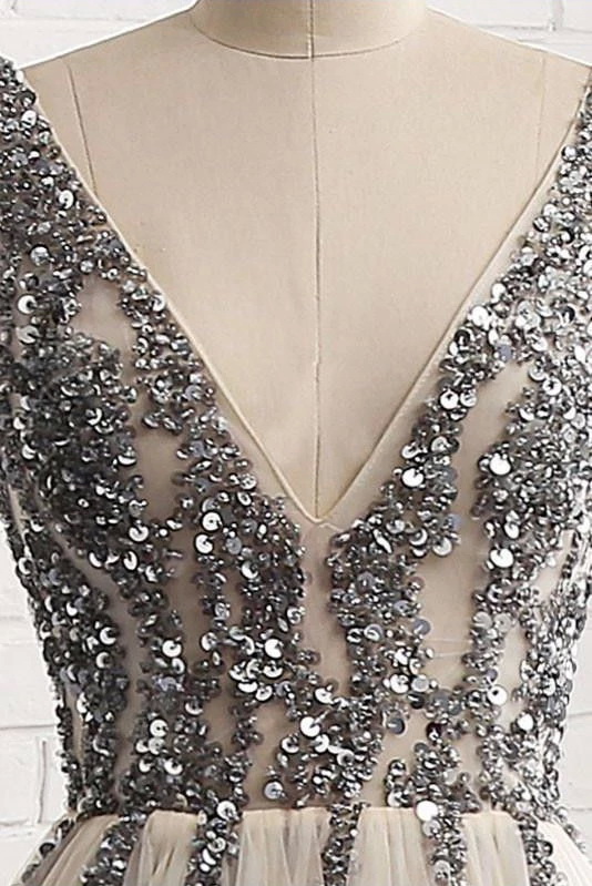Hot Sale Deep V-Neck A-Line Tulle Silver Sequin Prom Dresses Major Beading Floor Length Sexy Evening Dresses Backless Long Evening Gowns