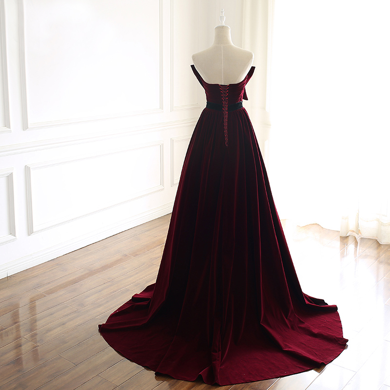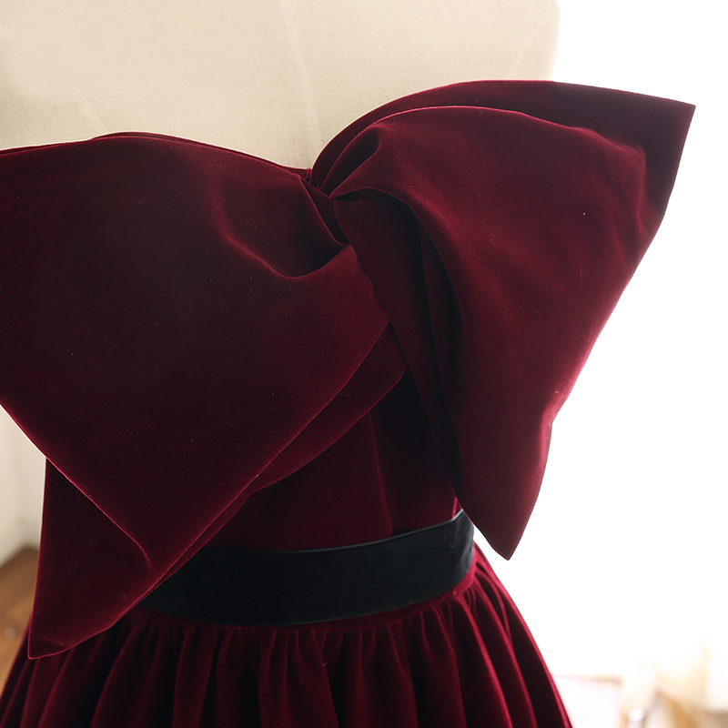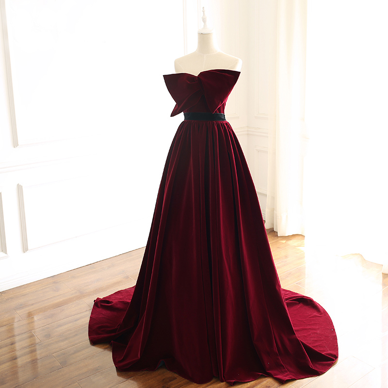 Elegant A-Line Strapless Burgundy Prom Dresses Cheap Pleated Skirt with Big Bow Velvet Prom Dress Lace Up Back Ladies Evening Gowns