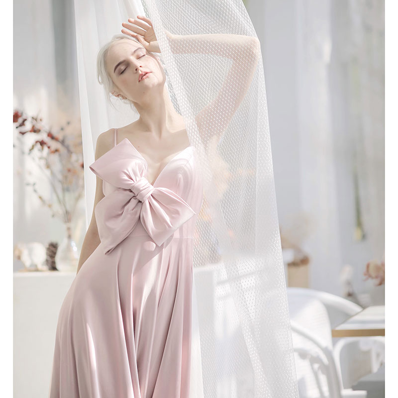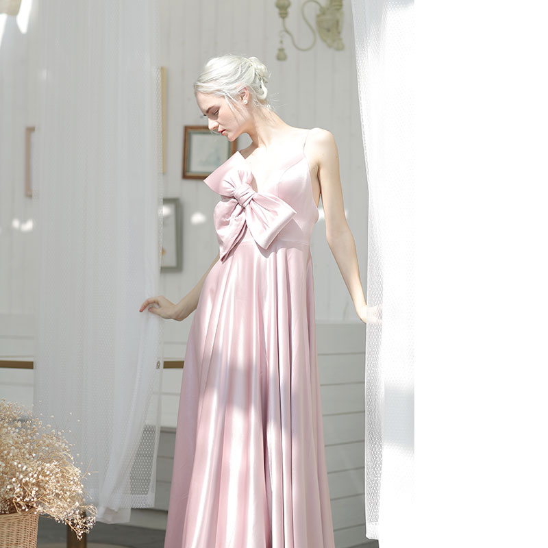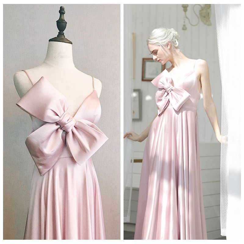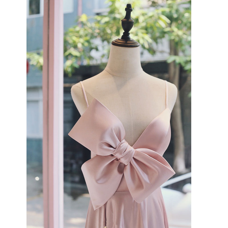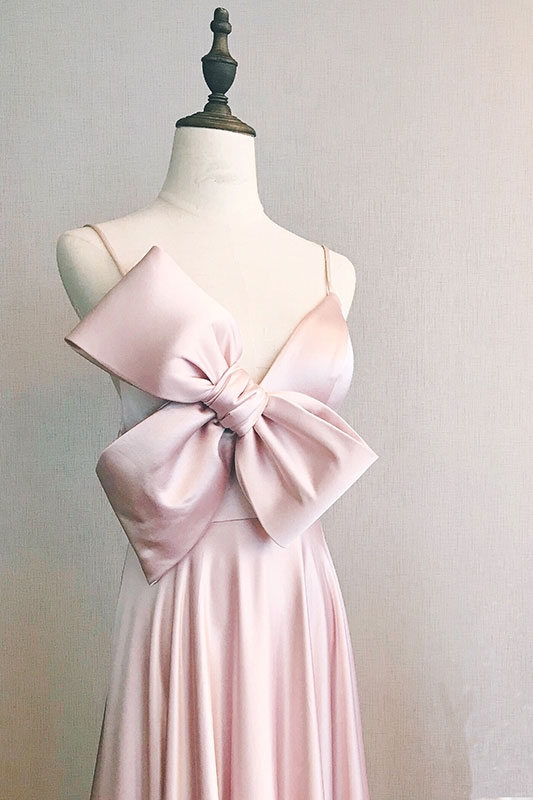 Attractive Designer Evening Gowns Thin Spaghetti Straps Satin Pink A-Line Elegant Evening Dresses with Big Bow Cocktail Dresses Evening Wear