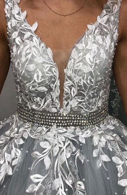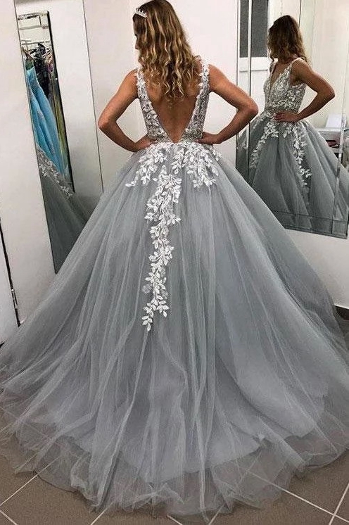Elegant Deep V-Neck A-Line Lace Prom Dresses Appliques Beaded Waist Grey Prom Dresses Pearls Beading Cheap Evening Gowns vestidos de gala