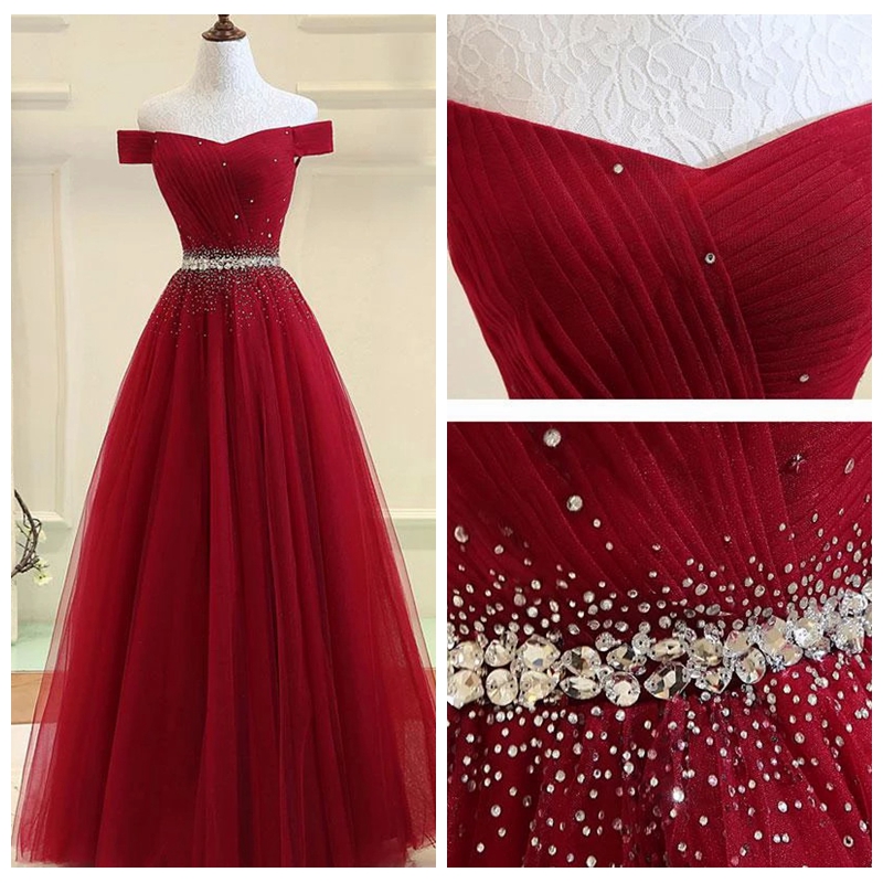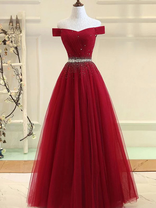 Elegant Off-shoulder Burgundy A-Line Cheap Evening Dresses Plus Size Crystals Beading Floor Length Formal Evening Gowns vestido de festa