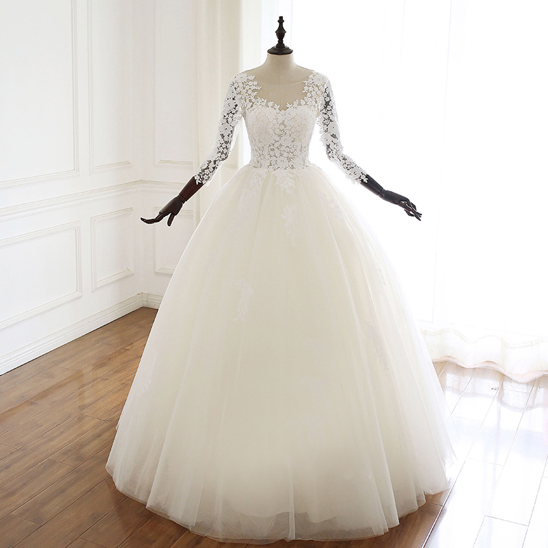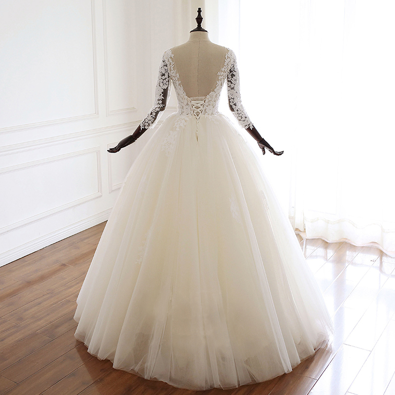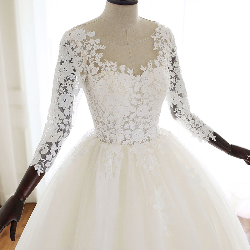 Classic Scoop White Fall Wedding Dresses with Sleeves Appliques Ball Gown Wedding Dress Low Back Floor Length Lace Wedding Gowns