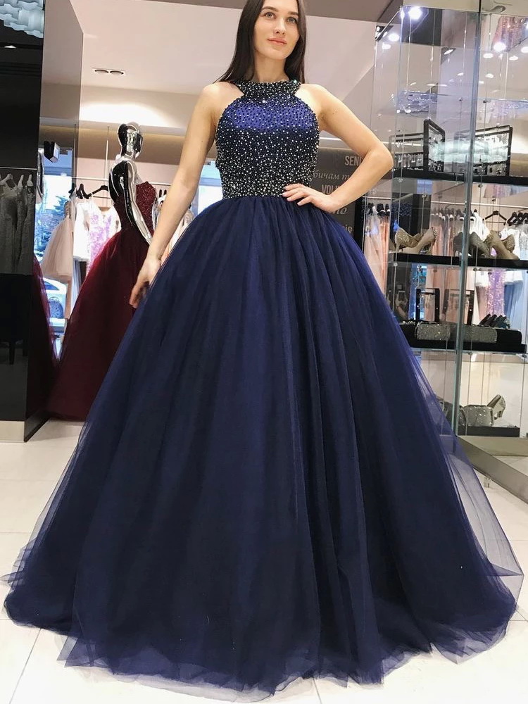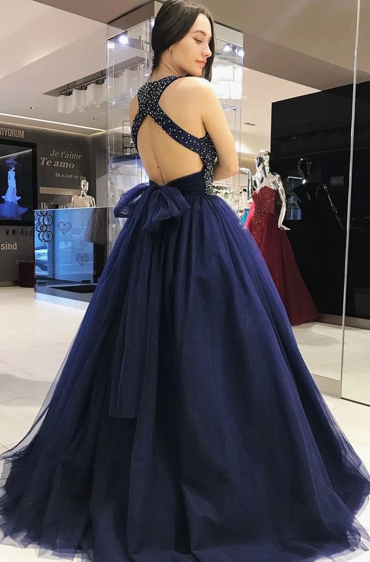 Elegant Evening Dresses Jewel Neck A-Line Navy Blue Prom Dresses Cheap Top Major Beading Sweep Train Hollow Back Vestido De Festa