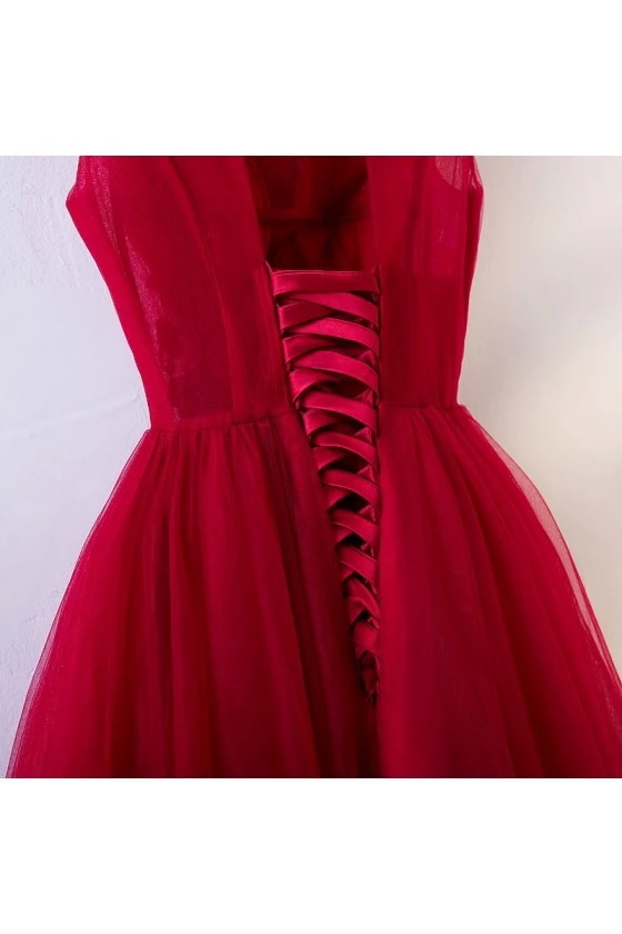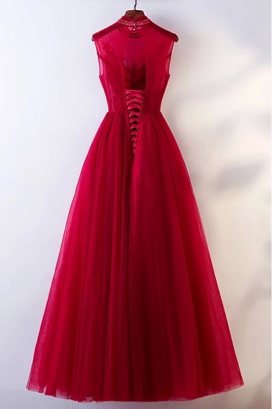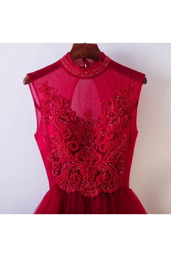 Unique Formal Evening Gowns High Neck A-Line Tulle Red Evening Dresses with Lace and Beading Open Back Cocktail Dresses Evening Wear