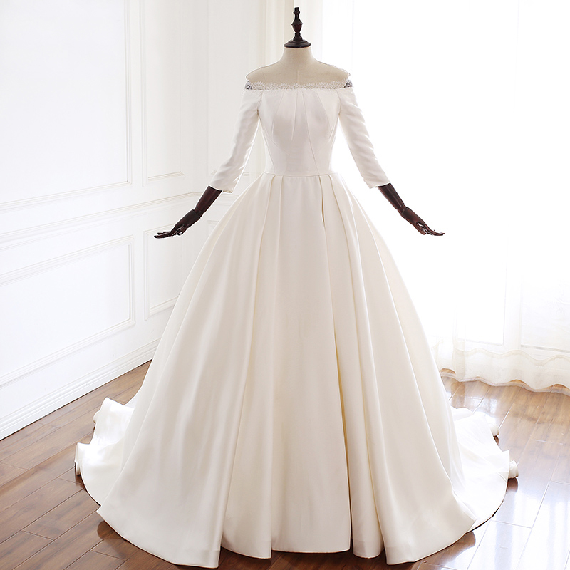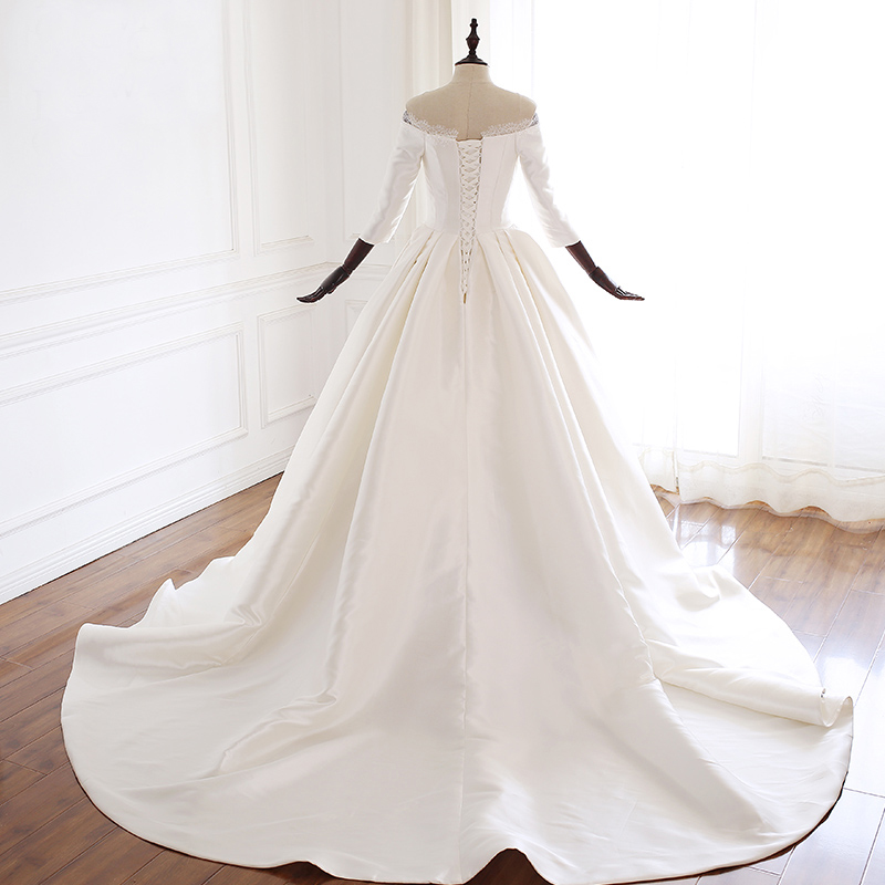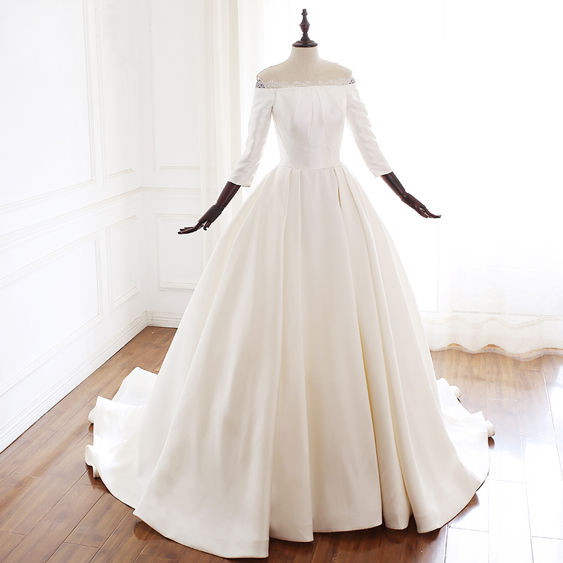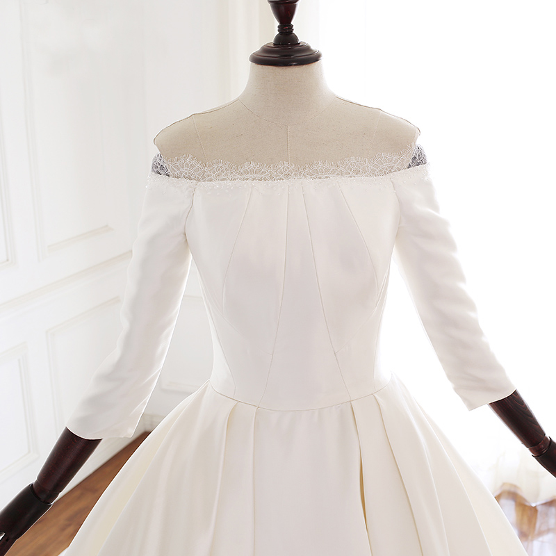 High Quality Vintage Wedding Gowns Ball Gown White Satin Wedding Dresses with Sleeves Lace Appliques Off Shoulder Wedding Dress for Sale
