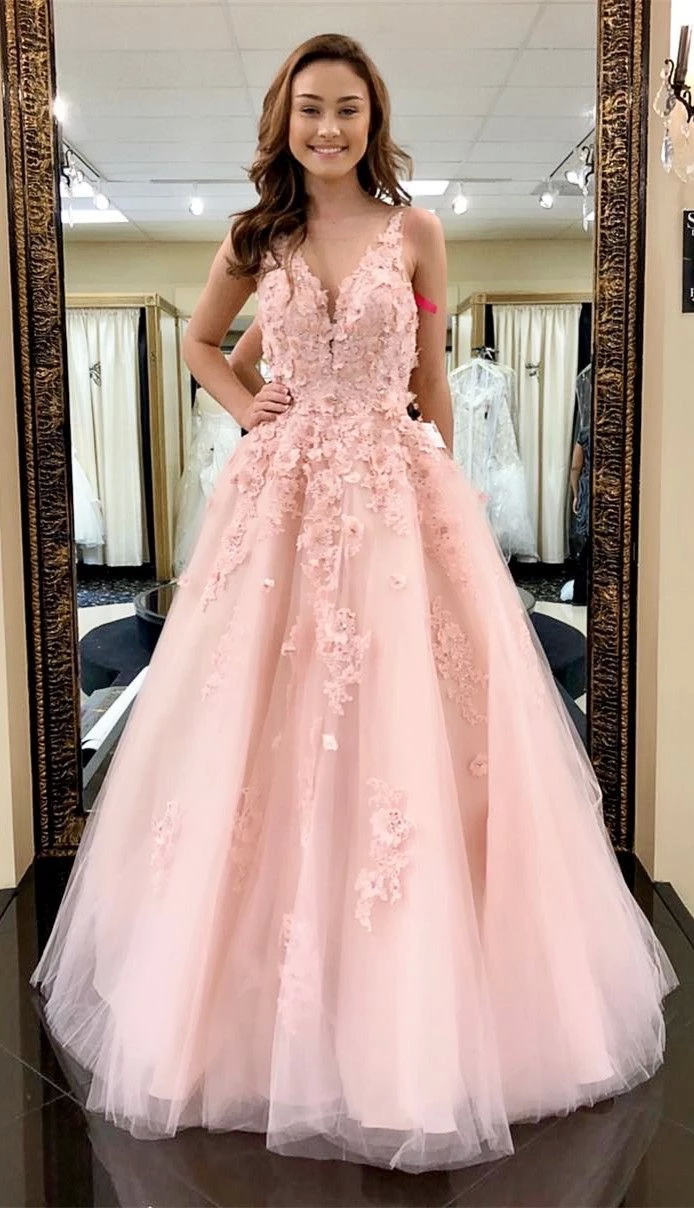 Sweet Sheer Neck A Line Evening Gowns with 3D Flowers Lace Applique Affordable Evening Dresses with Open Back Tulle Pink Prom Dresses