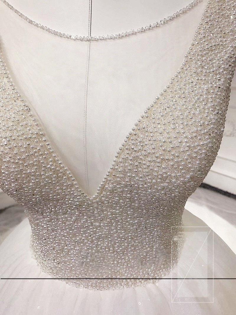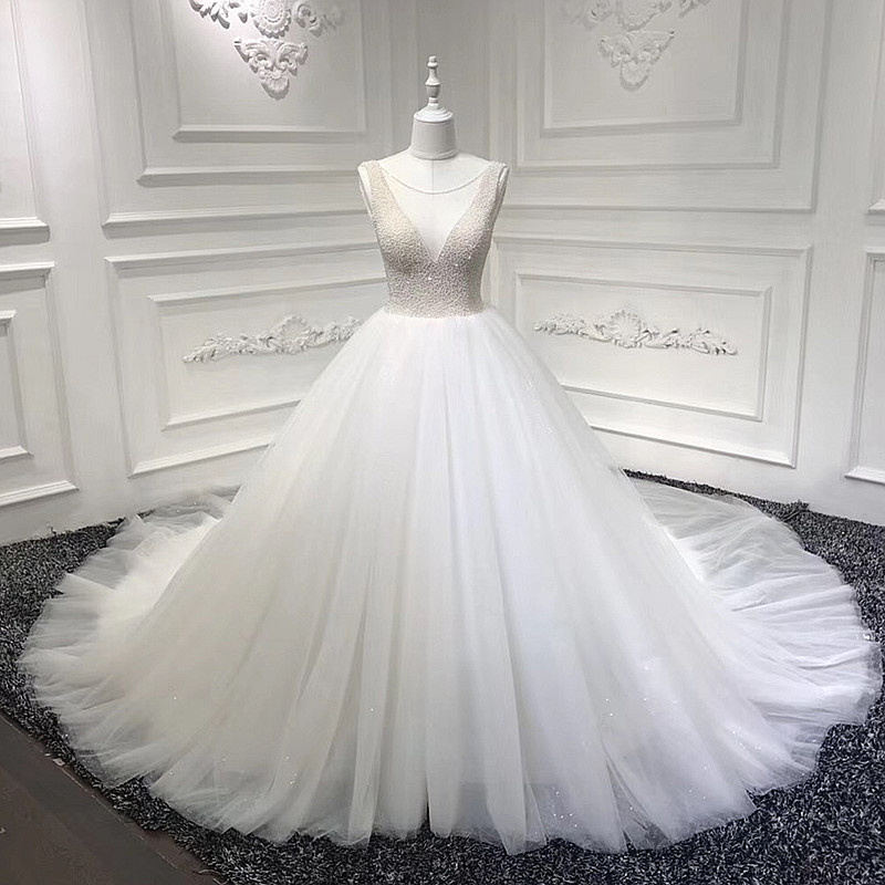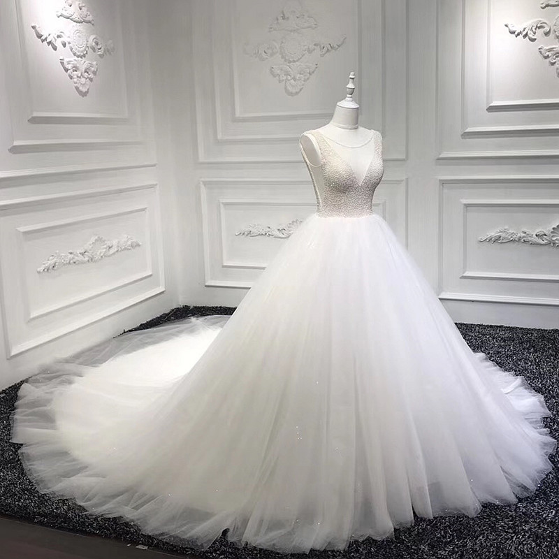 Sparkly Illusion Neck Ball Gown Tulle Plus Size Wedding Dresses Online Court Train Pearls Beaded Wedding Dresses Lace Up Back Bridal Gowns