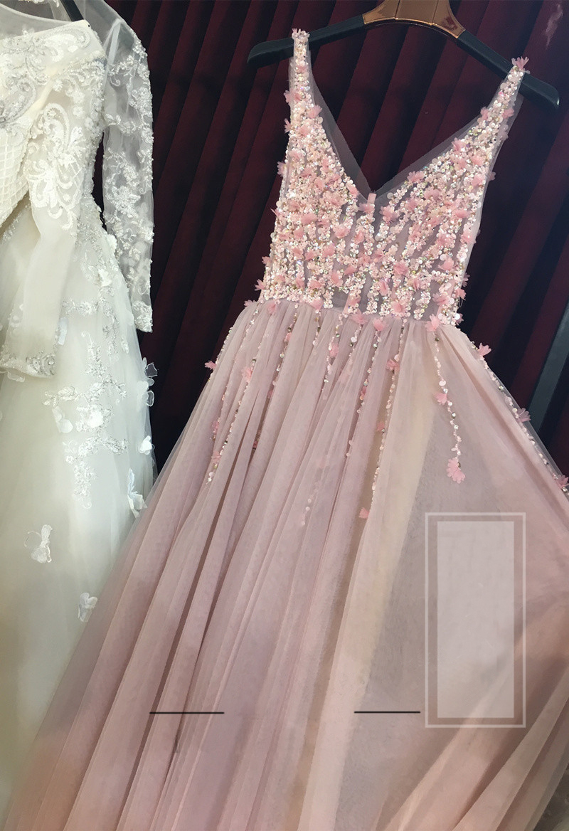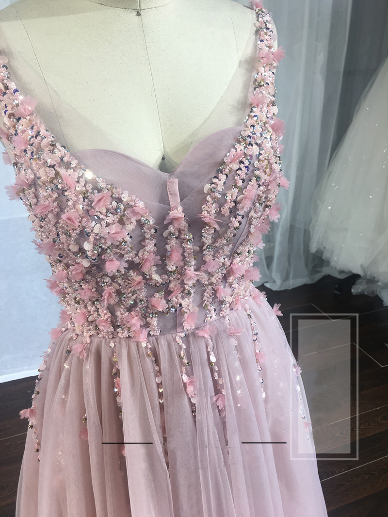 Sexy Formal Evening Gowns Deep V-Neck Dusty Pink Elegant Evening Dresses with 3D Flowers Major Beading Floral Prom Dresses Sweep Train