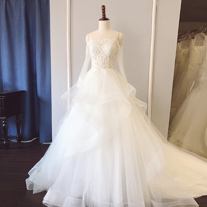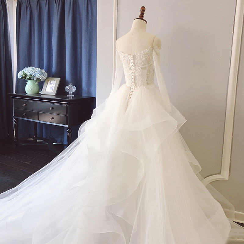 Chic Off-shoulder White Tulle Long Sleeve Wedding Dress Lace Appliques See Through A Line Wedding Dress Sweep Train Plus Size Wedding Gowns