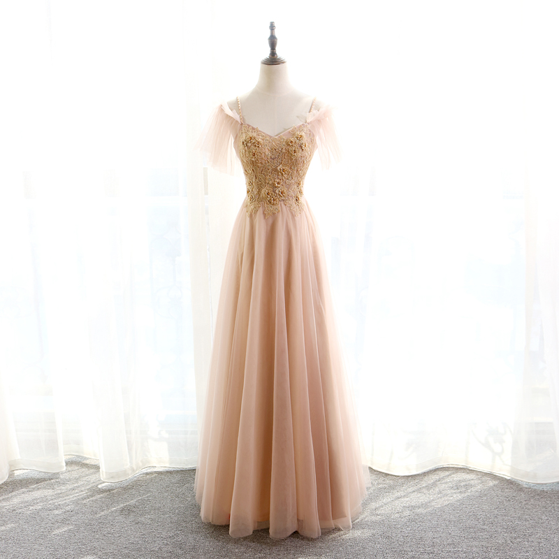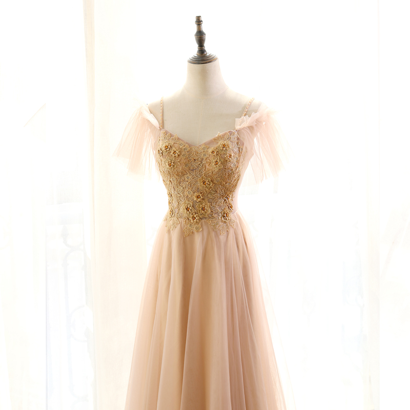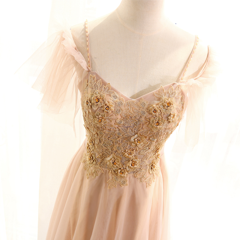 Spaghetti Straps A-Line Unique Prom Dresses Floor Length Lace Appliques Khaki Affordable Evening Dresses with 3D Flowers Evening Gowns
