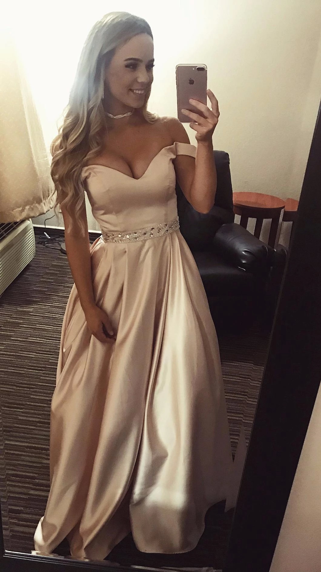Sexy Off the Shoulder Satin Evening Gowns with Waist Decoration Ruched Cheap Prom Dresses with Sweep Train Winter Long Evening Dresses