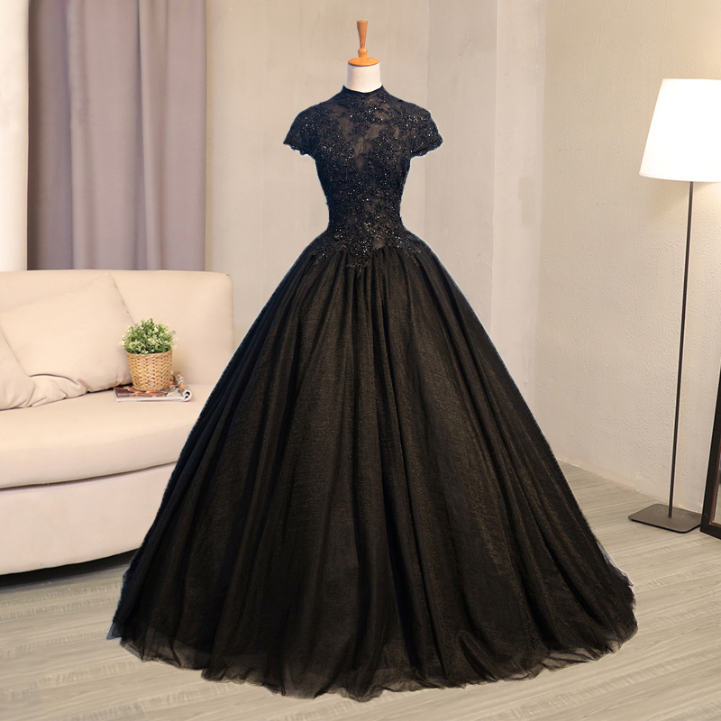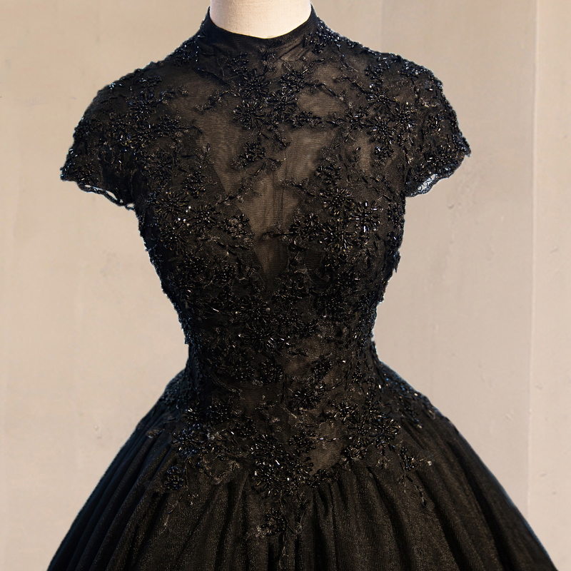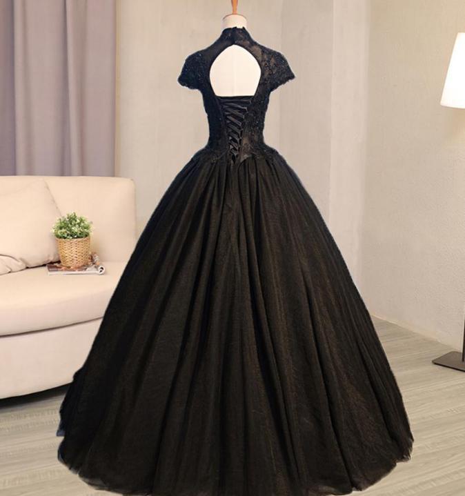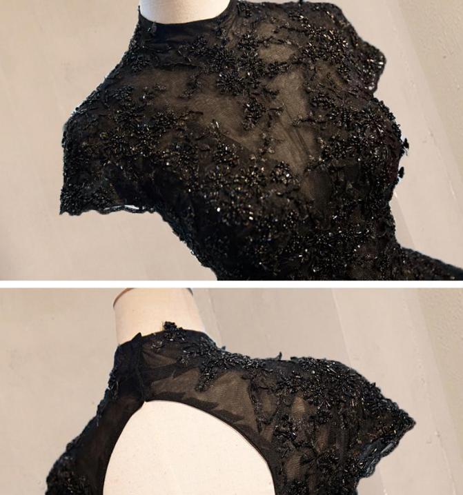 Exquisite High Neck Black Prom Dresses with Cap Sleeve A-Line Lace Appliques Vintage Prom Dresses Major Beading Engagement Party Dresses