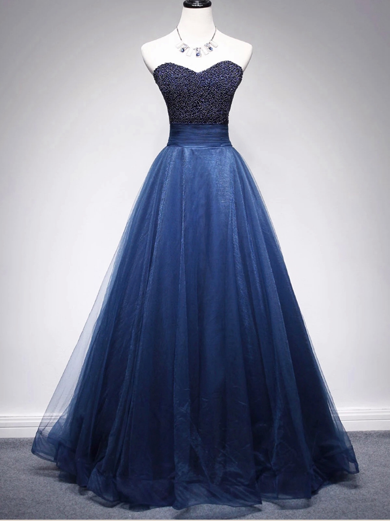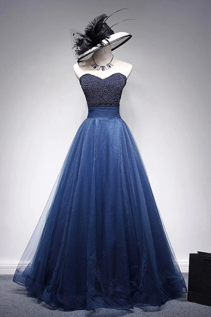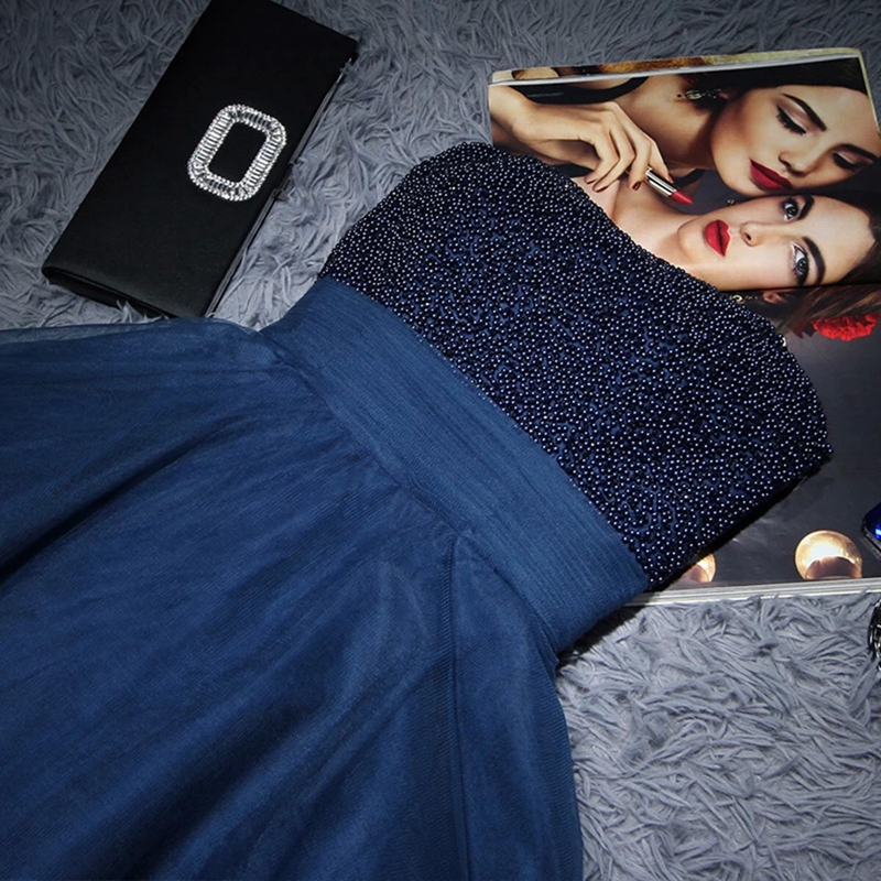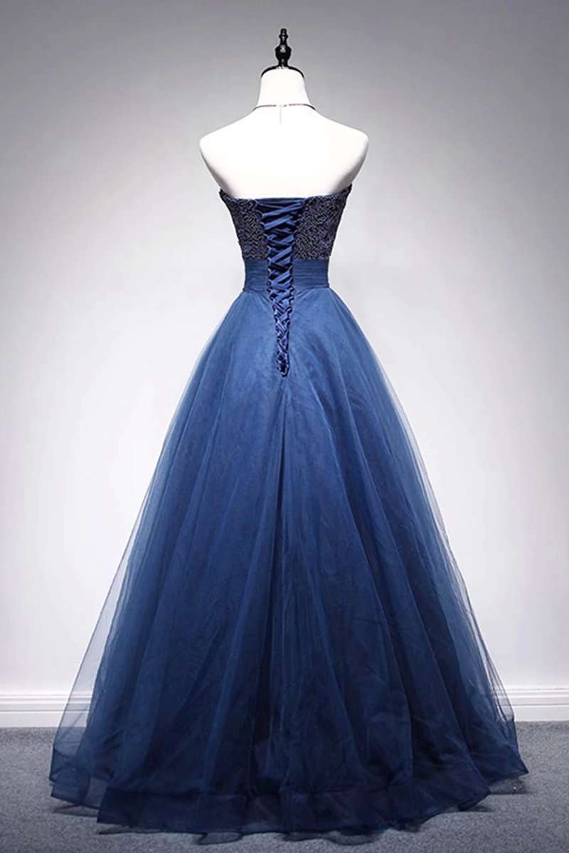 Elegant Strapless Navy Blue Prom Dresses Tiered Tulle Heavy Beaded Evening Dresses Long Lace Up A Line Evening Gowns with Sweep Train
