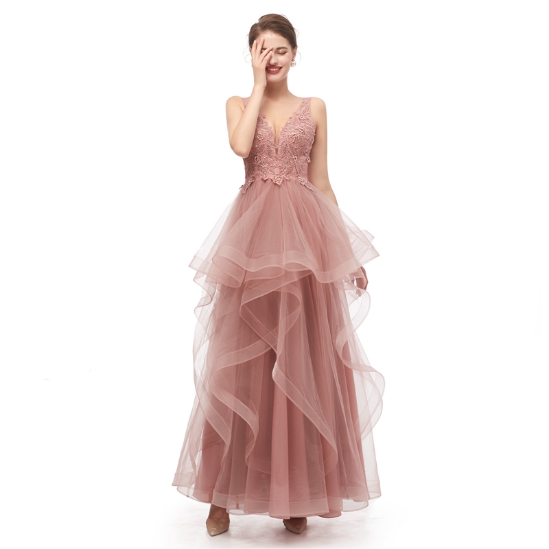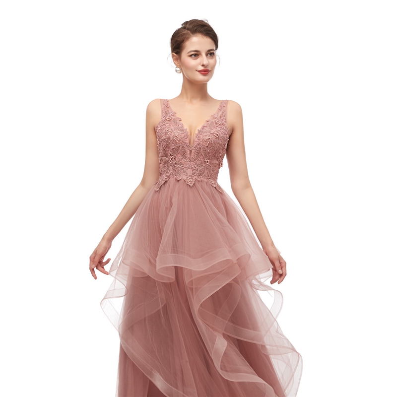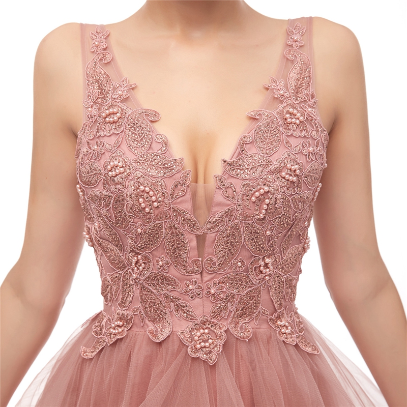 Elegant Prom Dresses on Sale A-Line Tulle Dusty Pink Prom Dresses Lace Appliques Pearls Beading Lace Prom Dresses vestidos de novia