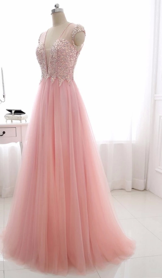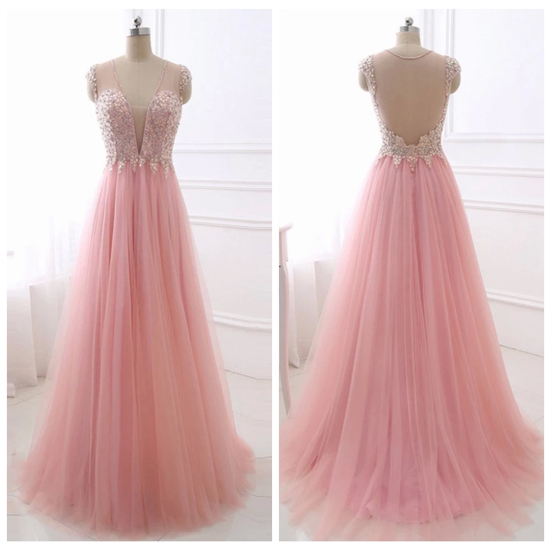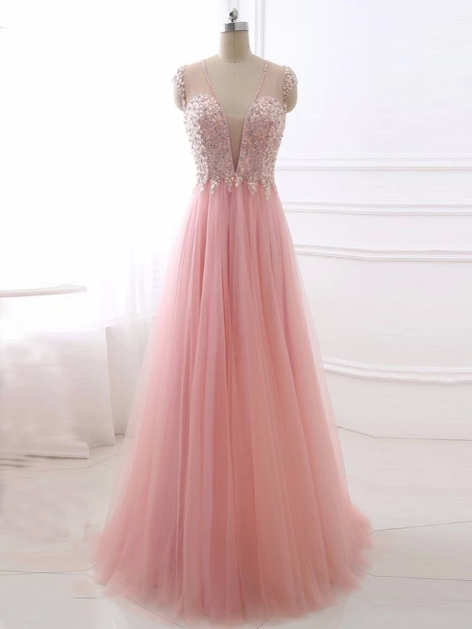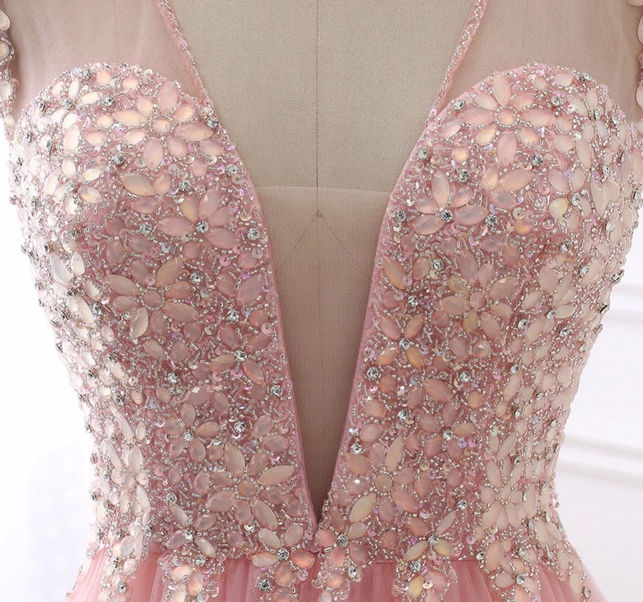 Sweet Sheer Neck Pink Prom Dresses with Sweep Train A Line Tulle Evening Dresses with See Through Back Beaded and Crystal Long Evening Gowns
