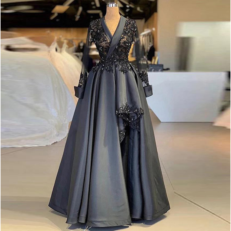 Elegant V-Neck A-Line Long Sleeve Evening Dresses Lace Appliques See Through Formal Evening Gowns Floor Length Grey Prom Dresses