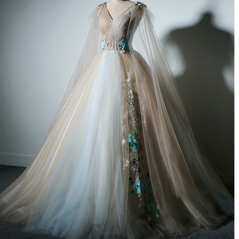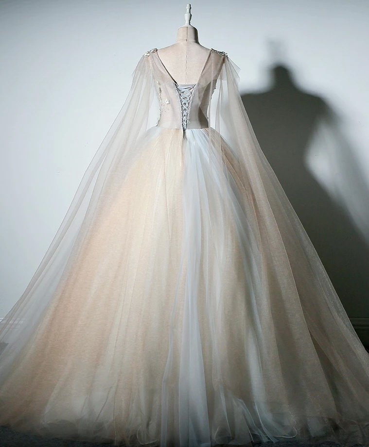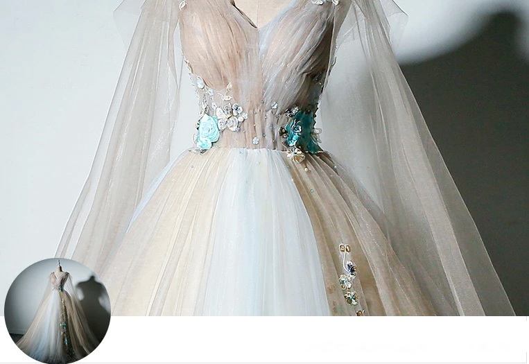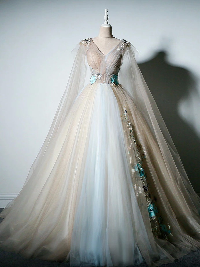 Gorgeous V Neck Bridal Dresses with 3D-Floral Appliques Beading Cheap Wedding Gowns with Watteau Train Puffy Tulle A Line Wedding Dresses