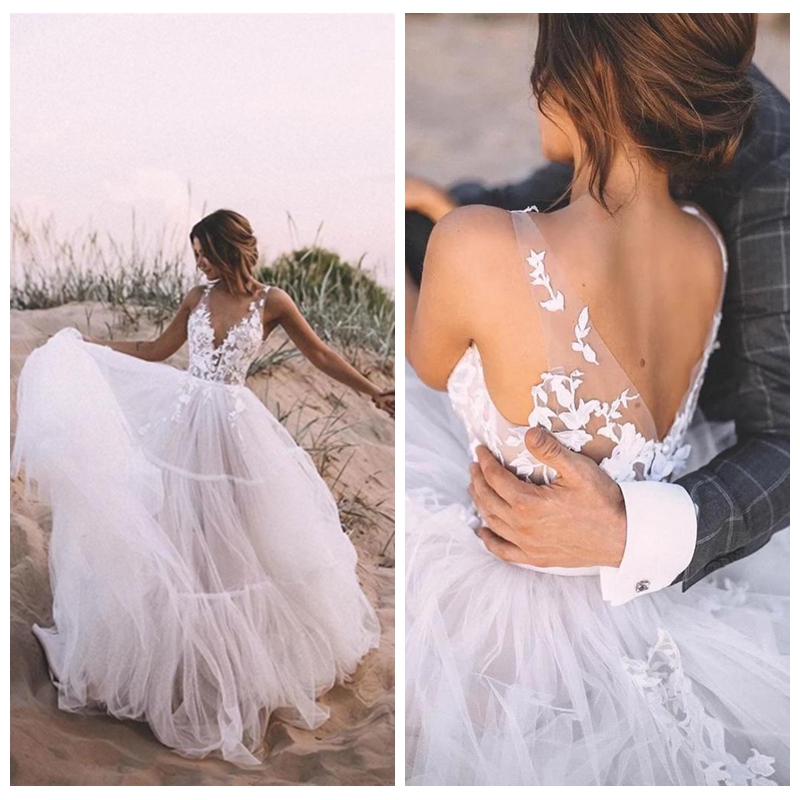 Custom Made A-Line Tulle V Neck Wedding Dress Lace Appliques Cut V Back Bohemian Wedding Dress for Beach Plus Size Wedding Gowns