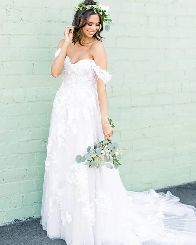 Stunning A-Line Off Shoulder Wedding Dress Lace Appliques Sweep Train Beachy Wedding Dresses with Sleeves Elegant Wedding Gowns Bridal Dress
