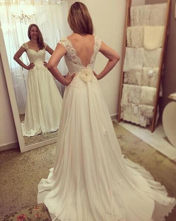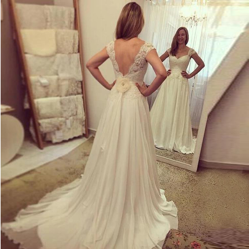 Simple Sweetheart A-Line Chiffon Wedding Dress Lace Appliques Court Train Beach Wedding Dresses Low Back Bridal Gowns voiles de mariage