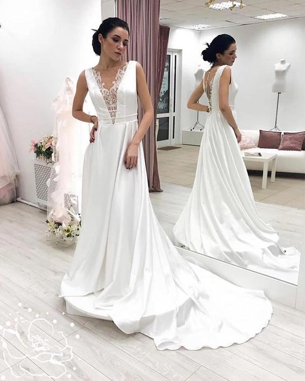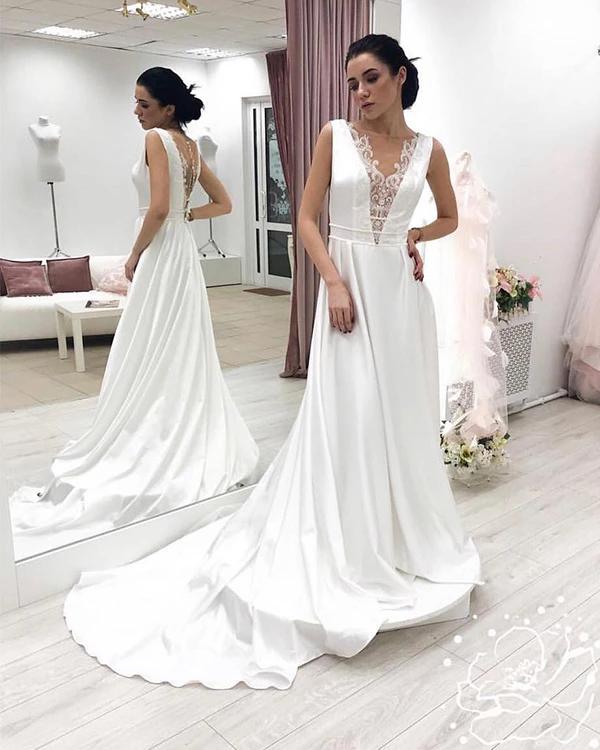 Modest Wedding Dresses A-Line White Satin Court Train Modern Wedding Dresses Lace Appliques Covered Buttons vestidos de noche Bridal Gowns