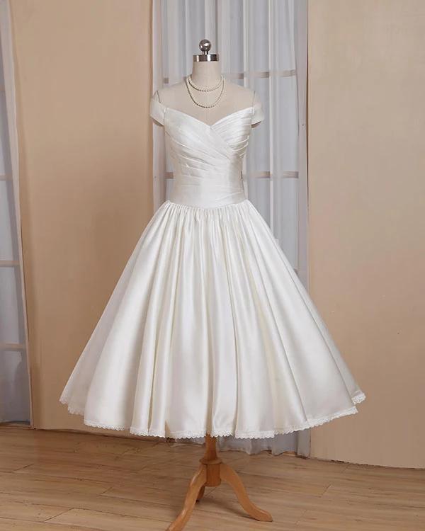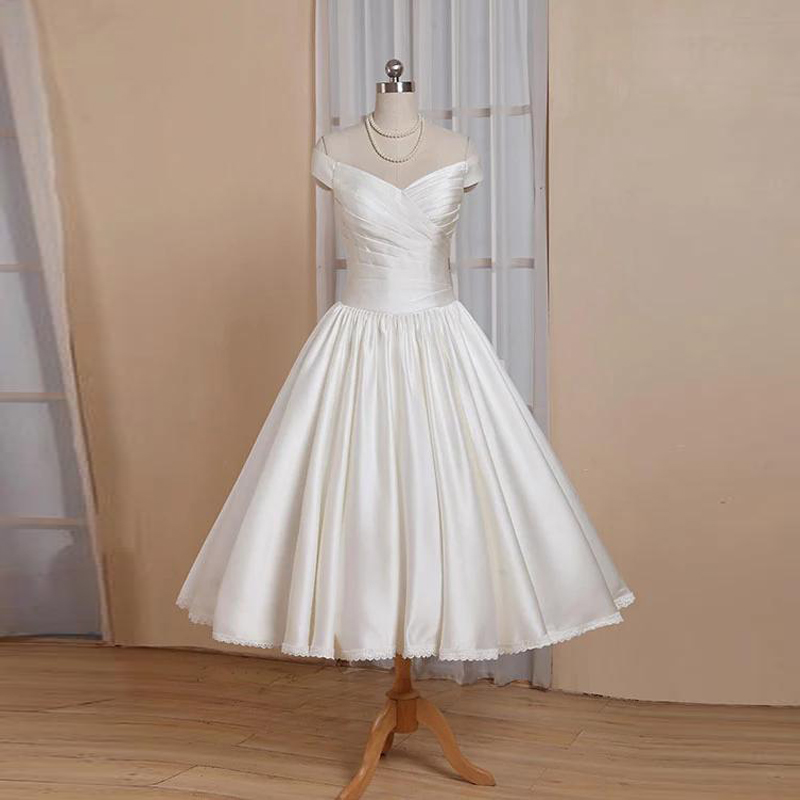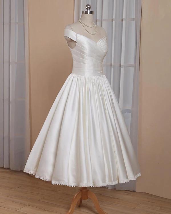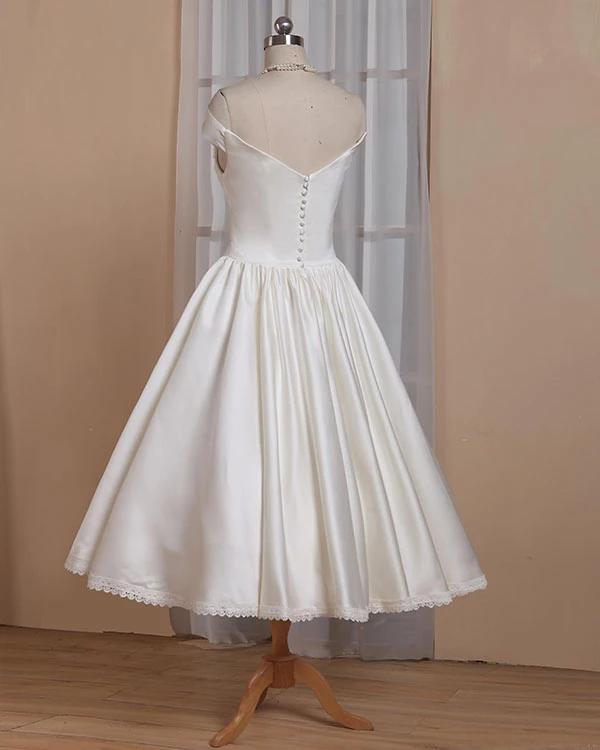 Simple Short White Wedding Dress Off-shoulder Satin Wedding Dresses with Sleeves Pleated Skirt Lace Edge Covered Buttons Vestidos De Novia
