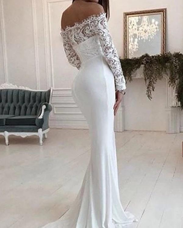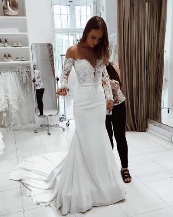 Sexy Off-shoulder White Sheath Wedding Dresses Long Sleeve Lace Appliques Covered Buttons Bridal Gowns Online vestidos cortos de fiesta
