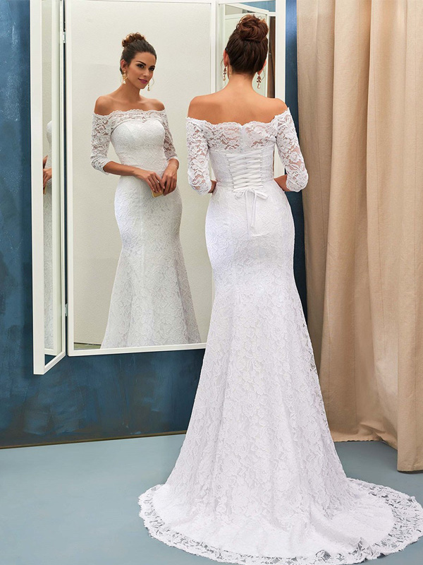Elegant White Lace Mermaid Wedding Dress Court Train Lace Up Back Off The Shoulder Wedding Dresses with Sleeves voiles de mariage