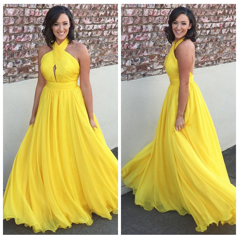 Stunning Halter Chiffon Yellow Prom Dresses A-Line Pleated Brest Elegant Evening Dresses with Sweep Train Formal Evening Gowns