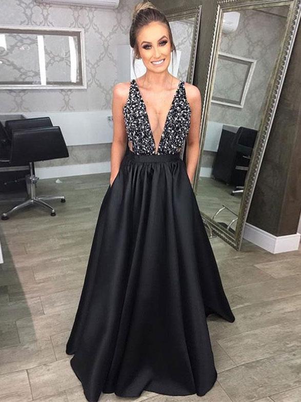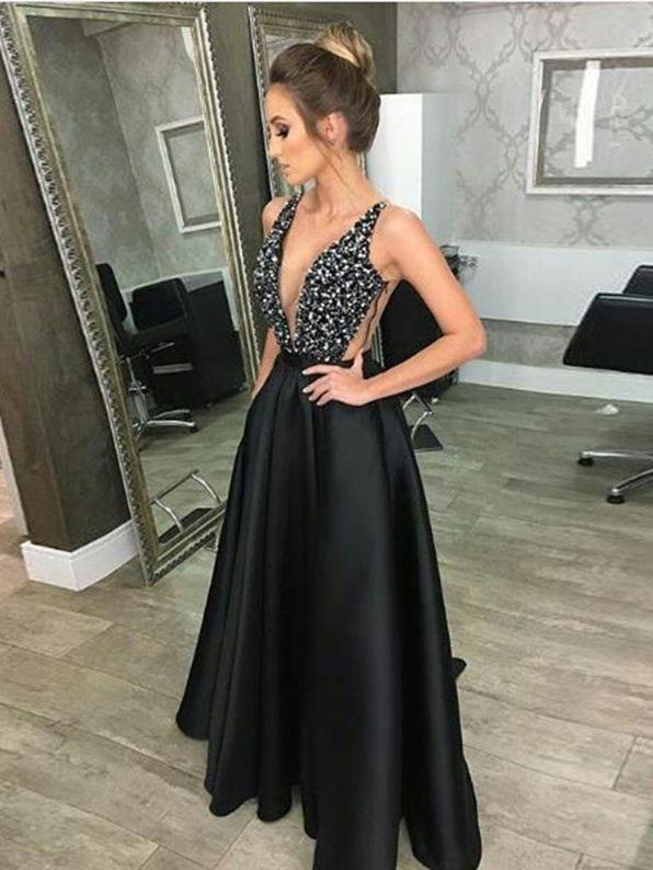 Sexy Prom Dresses on Sale Deep V-Neck Cutaway Sides Rhinestones Beading Black Formal Dresses Bodice vestido de festa plus size longo