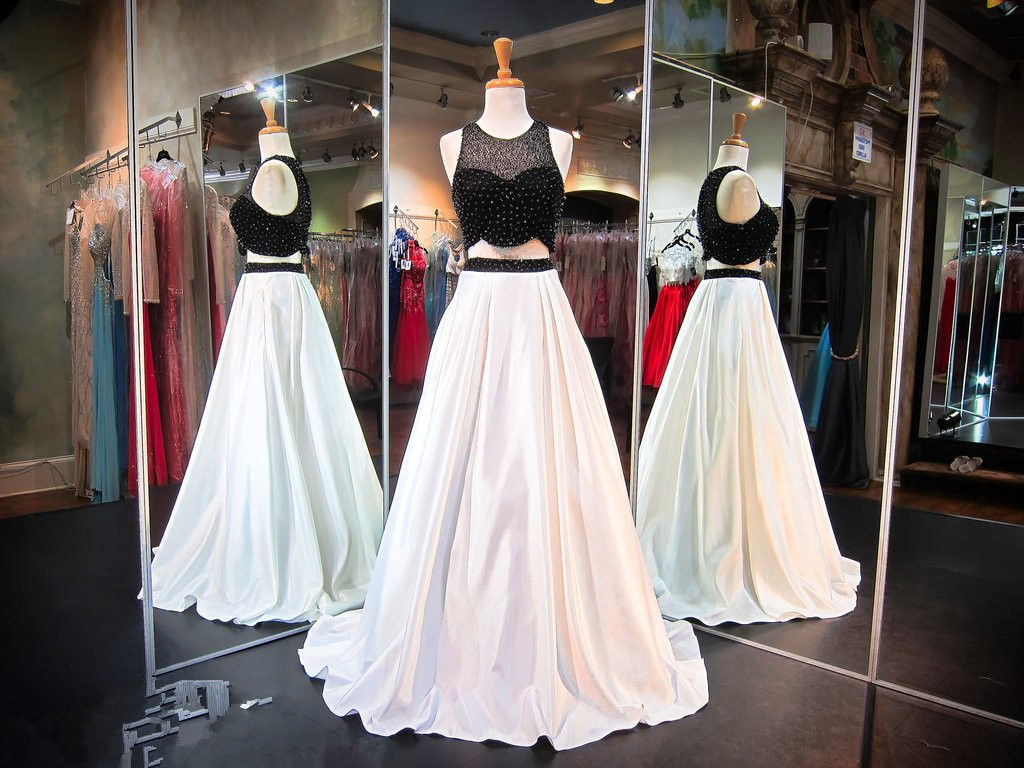 Glittering Scoop 2 Piece Prom Dresses A-Line Sweep Train Top Beading Black and White Prom Dresses Zipper Up Back Formal Evening Gowns